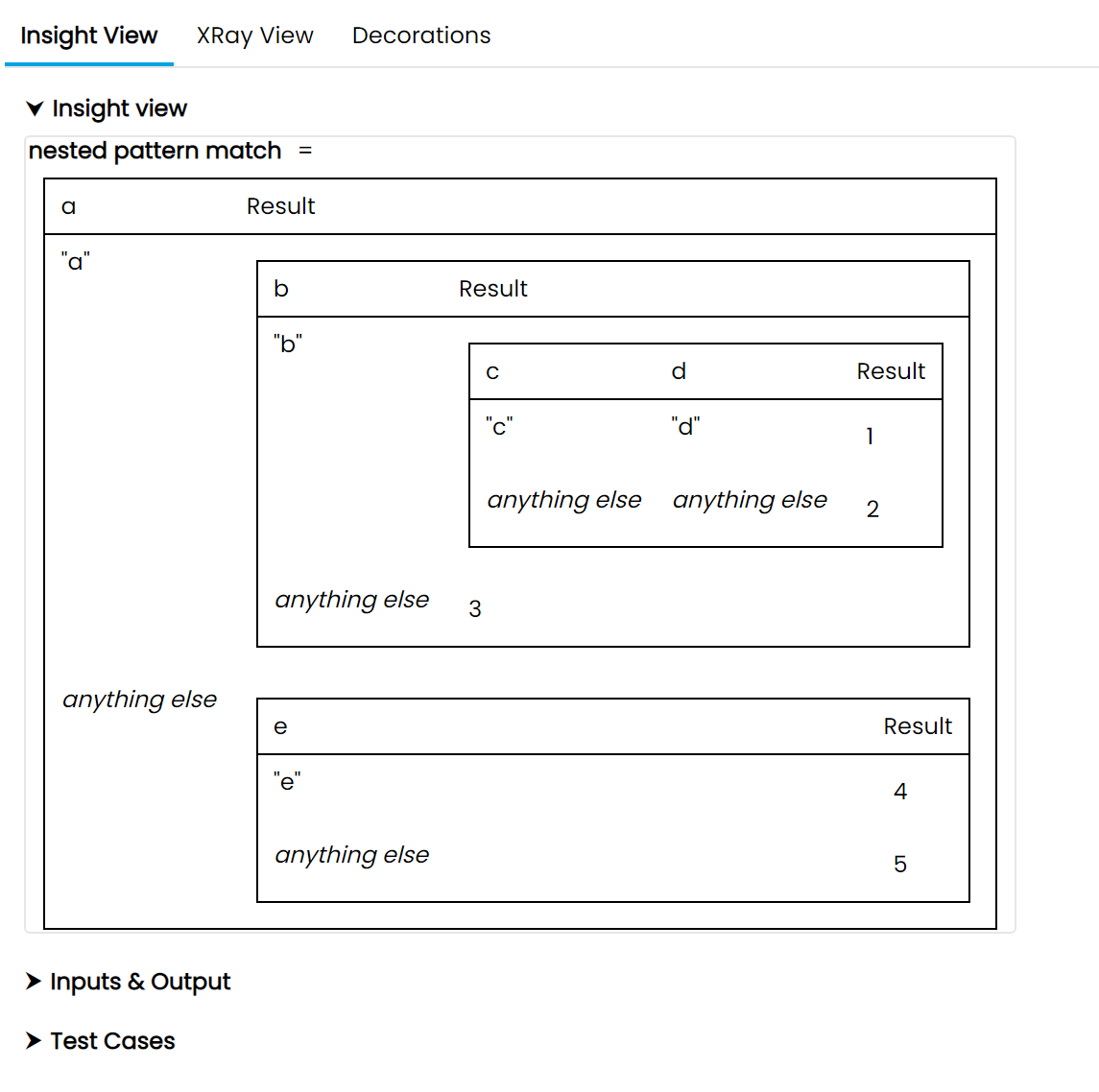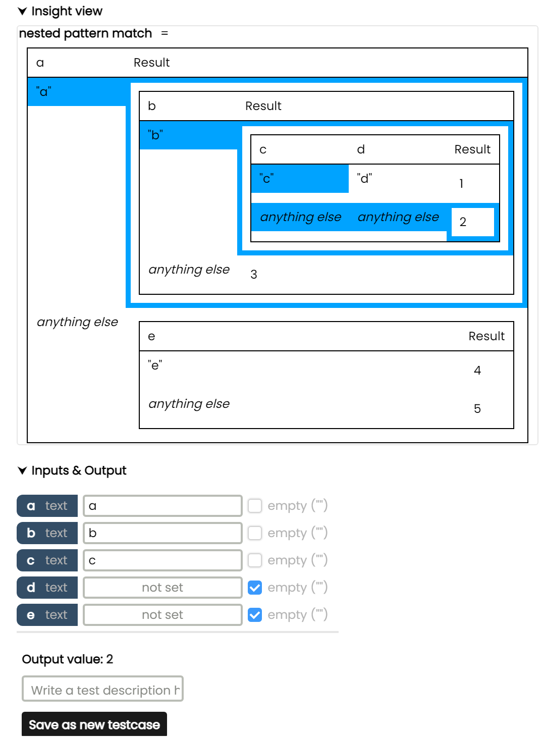 Here the here we can see a nested pattern match visualised as nested decision tables. The function has 5 inputs, named a, b, c, d and e.