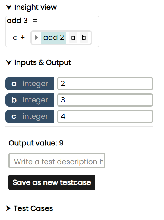 The user then is able to save this scenario as a test case, after which it will be listed at the bottom, in the Test Cases section. The user can also click on one of these tast cases to load them back into the Insight view.