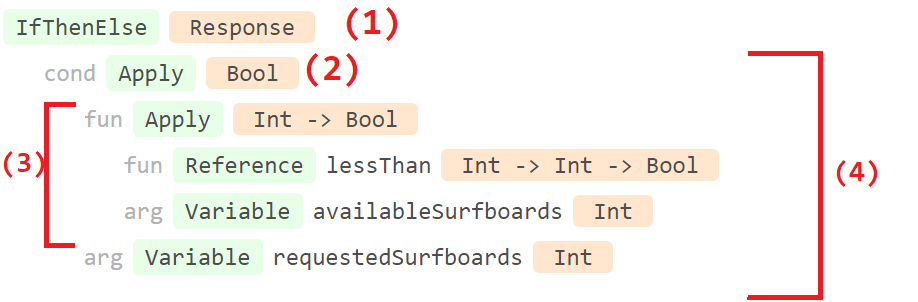 The condition has two child nodes, a function, and an argument. The function can be thought of as "Is availableSurfboards less than X" (3), and it also has two child nodes, the lessThan function, and our availableSurfboards input Variable. The whole thing can be read as: Take availableSurfboards, Apply the lessThan function to it, and then Apply this function to requestedSurfBoards, creating our condition "Is availableSurfboards less than requestedSurfBoards" (4).